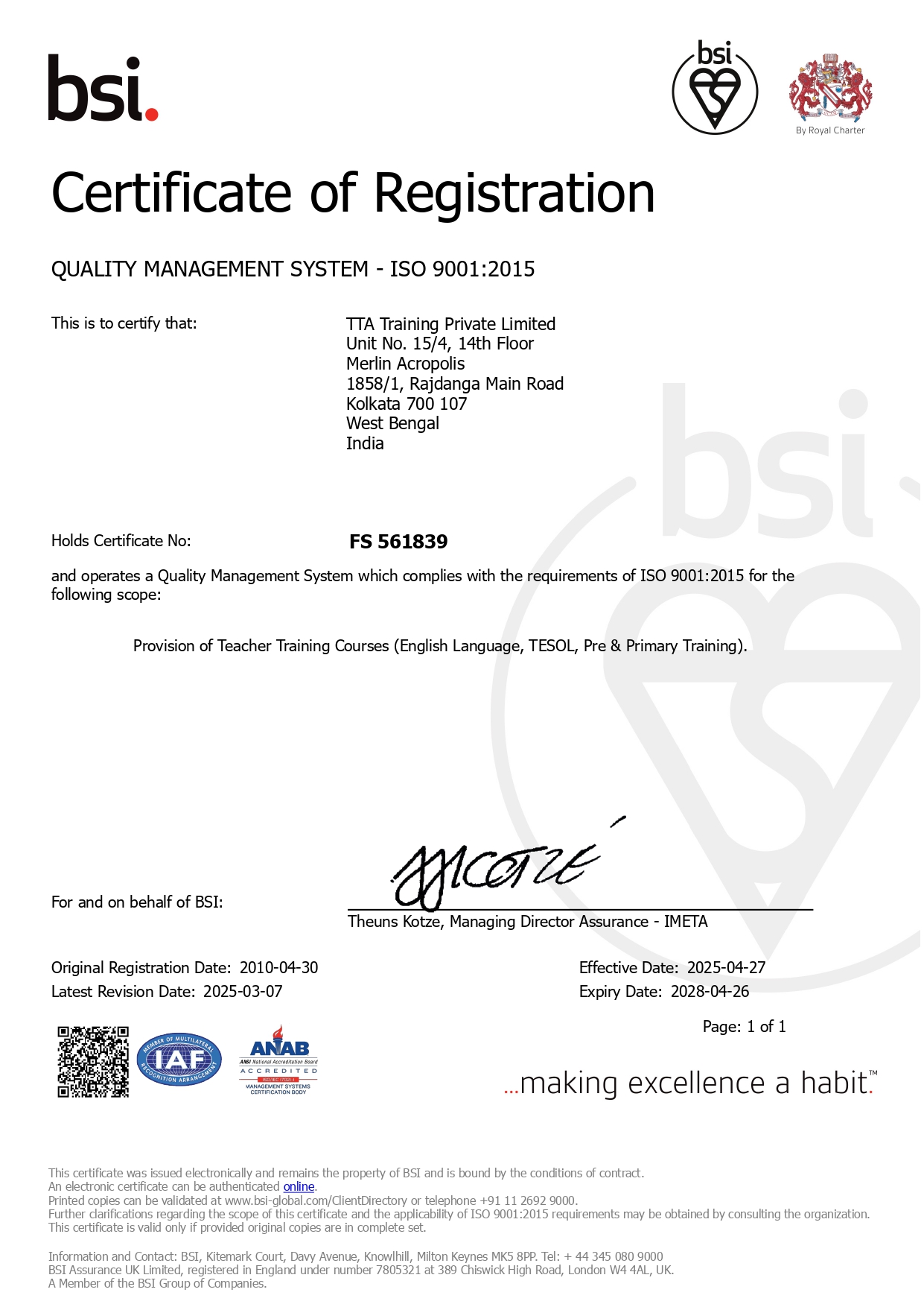 TTA Training Pvt. Ltd. that trades as Asian College of Teachers is registered under the Ministry of Corporate Affairs, Government of India.
